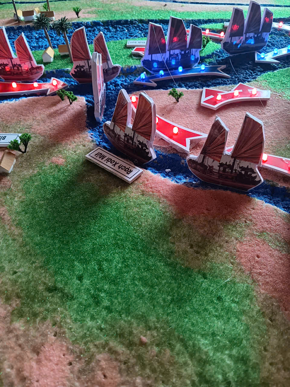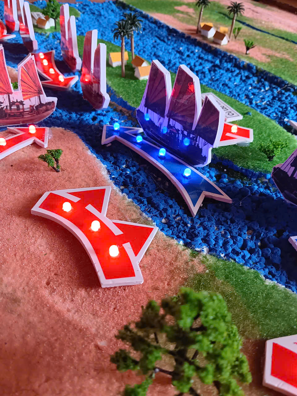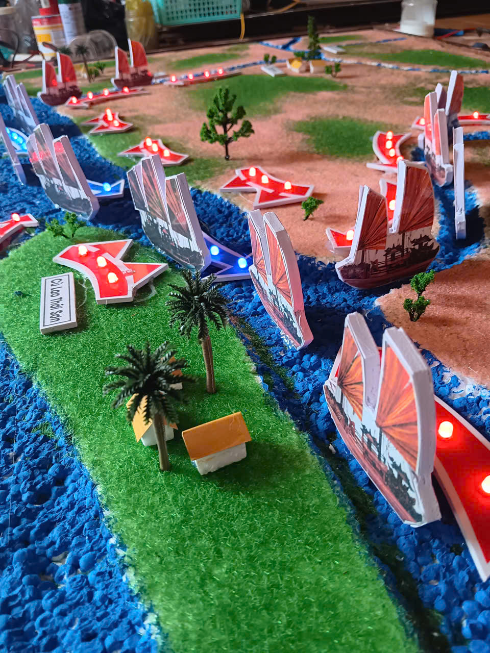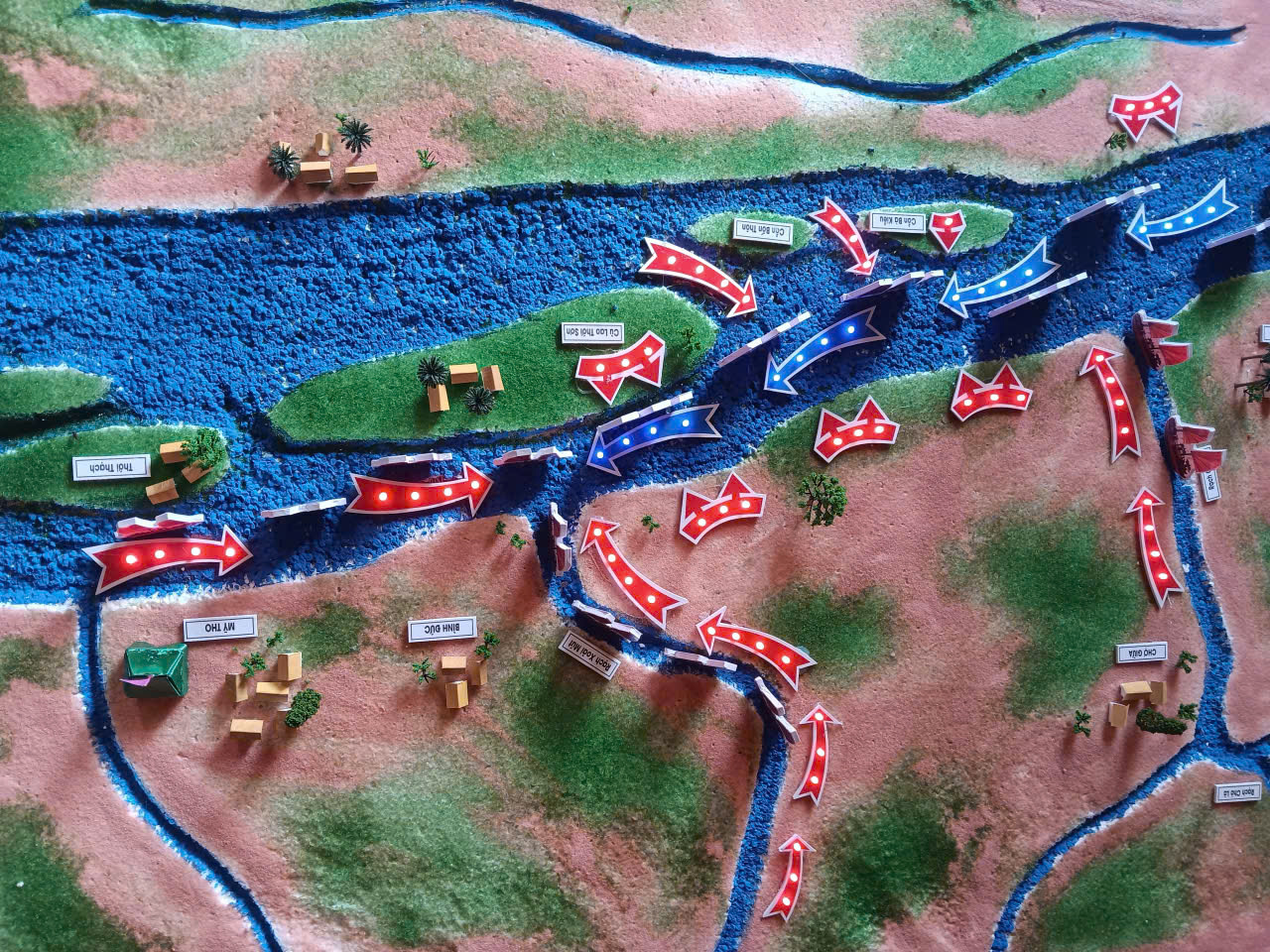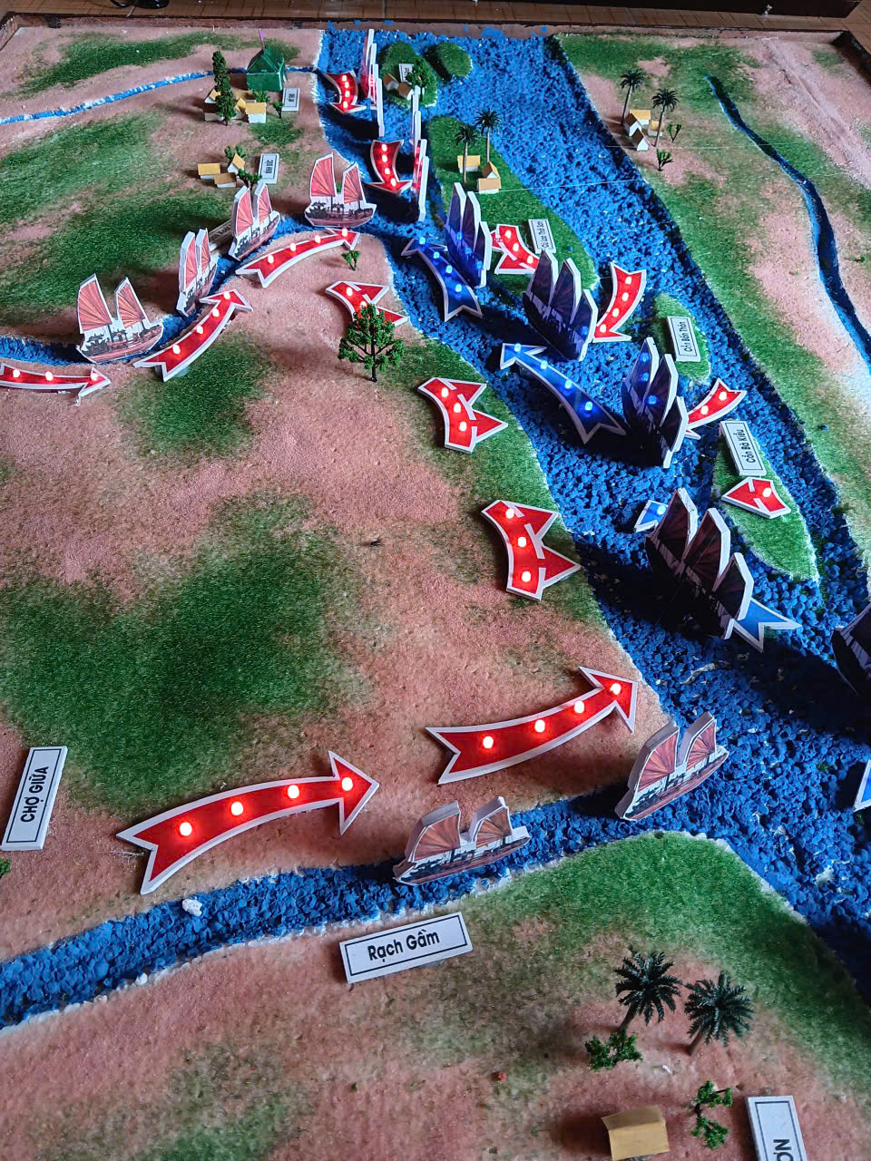 Đèn chạy theo các mũi tên tiến quân của quân Xiêm và của quân ta, xen vào đó là các thuyến thuyến quân Xiêm và quân ta chặn đánh. |